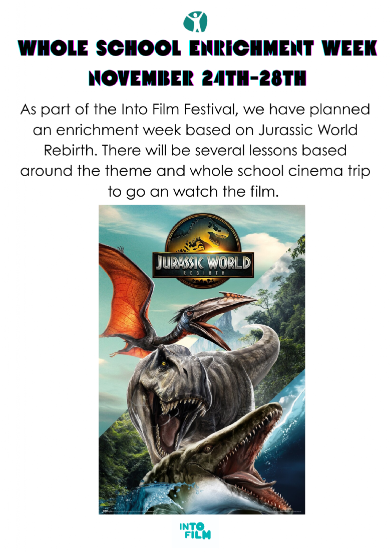 Into Film Festival Enrichment Week This term we have planned an enrichment week based on the theme of evolution and dinosaurs. This links in with the students' choice of film for the Into Film Festival, Jurassic World Rebirth.